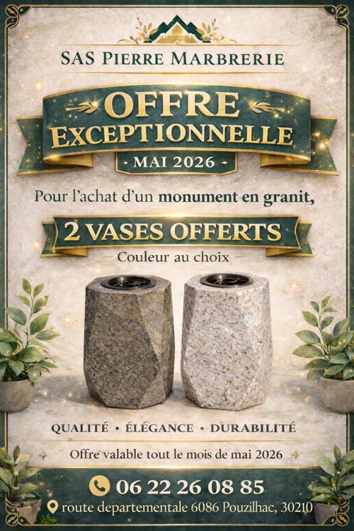 Offre exceptionnelle pour l’achat d’un monument en granit, 2 vases offerts (couleur au choix), offre valable tout le mois de mai 2026.